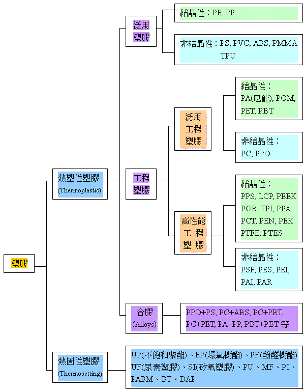 一般而言,塑膠原料可大分為兩大類:「熱塑性塑膠」(Thermoplastic)及「熱固性塑膠」(Thermosetting)。熱塑性塑膠在常溫下通常為顆粒狀,加熱到一定溫度後變成熔融的狀態,將其冷卻後則固化成型,若再次加熱則又會變成熔融的狀態,而可進行再次的塑化成型。因此,熱塑性塑膠可經由加熱熔融而反覆固化成型,所以熱塑性塑膠的廢料通常可回收再利用,亦即有所謂的「二次料」。相反的,熱固性塑膠則是加熱到一定溫度後變成固化狀態,即使繼續加熱也無法改變其狀態。因此,熱固性塑膠無法經由再加熱來反覆成型,所以熱固性塑膠的廢料通常是不可回收再利用的。其分類方式如下圖所示。